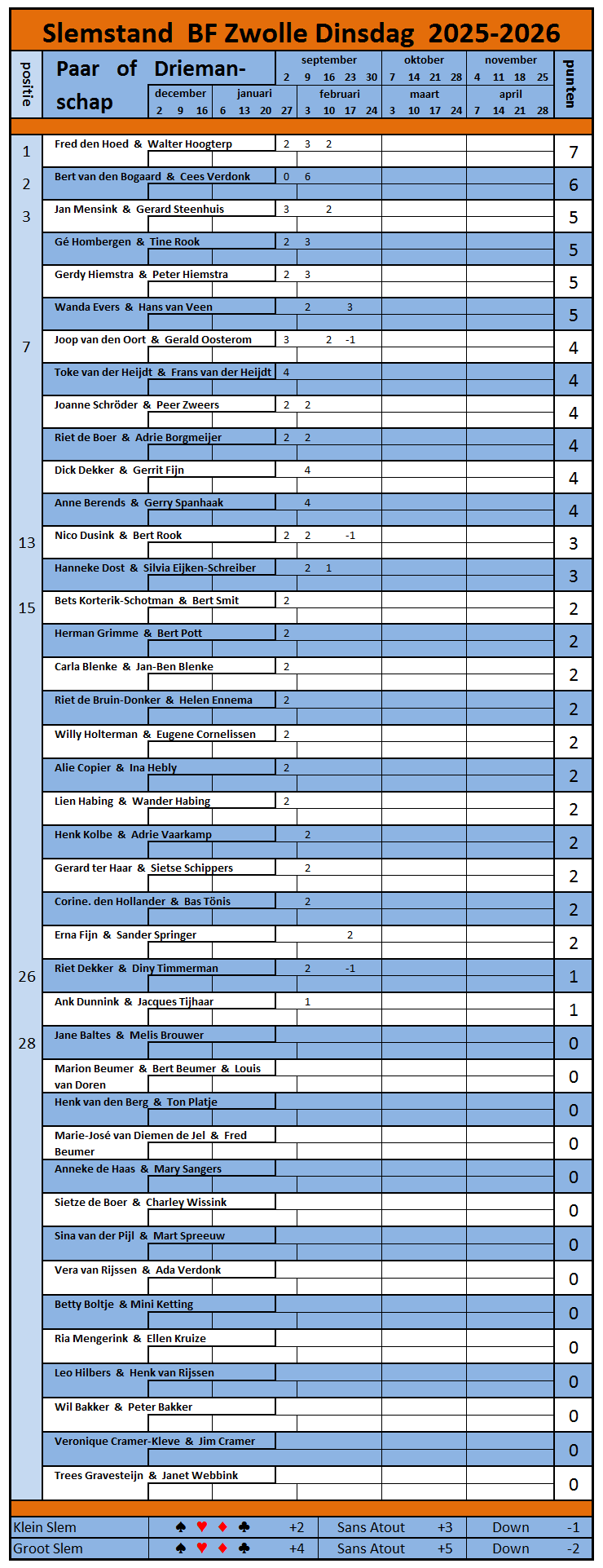 Stand (uitleg puntentelling) Slemkampioenschap Dinsdag: