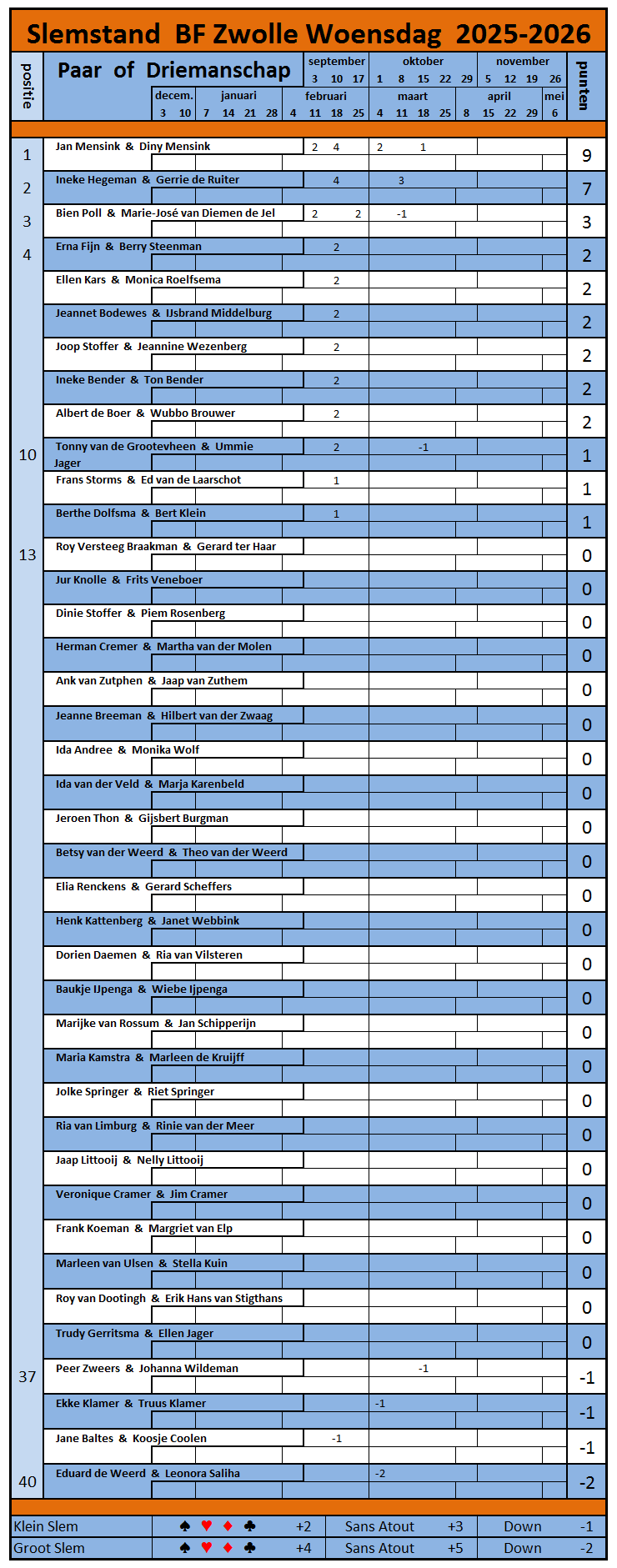 Stand (uitleg puntentelling) Slemkampioenschap Woensdag: