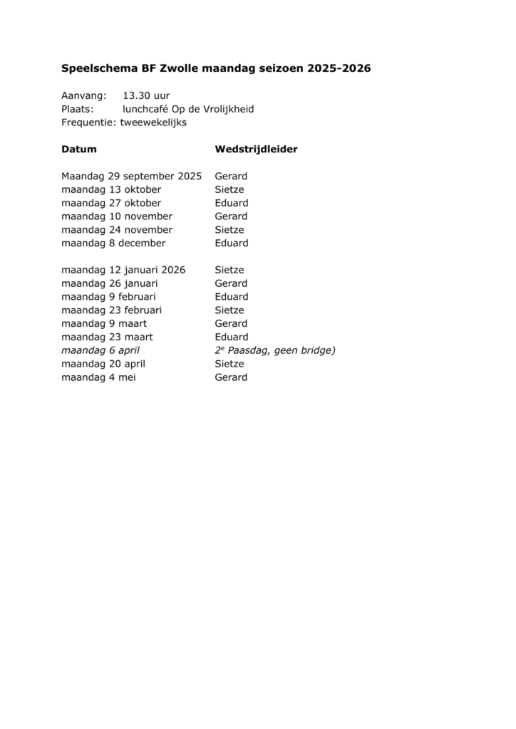 Maandagmiddag-bridge 22 december gaat niet door.